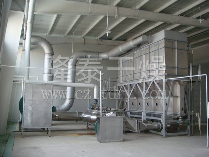 沸腾干燥,又称流化床,它是由空气过滤器、加热器、沸腾床主机,旋风分离器,布袋除尘器、高压离心风机、操作台组成,由于干燥物料的性质不同,配套除尘设备时,可按需要考虑,可同时选择旋风分离器、布袋除尘器,也可选择其中一种,一般来说比重较大的如冲剂及颗粒料干燥只需选择旋风分离器,比重较轻的小颗粒状和粉状物料需配套布袋除尘器,并备有气力送料装置及皮带输送机供选择。