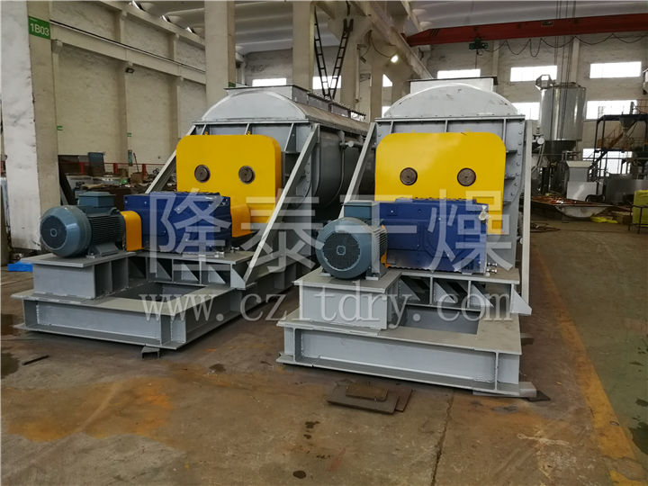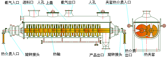 空心轴上密集排列着楔型中空浆叶,热介质经空心轴流经浆叶。单位有效容积内传热面积很大,热介质温度从-40℃到320℃,可以是水蒸汽,也可以是液体型:如热水、导热油等。间接传导加热,没有携带空气带走热量,热量均用来加热物料。热量损失仅为通过器体保温层向环境的散热。楔型浆叶传热面具有自清洁功能。物料颗粒与楔型面的相对运动产生洗刷作用,能够洗刷掉楔型面上附着物料,使运转中一直保持着清洁的传热面。浆叶干燥机的壳体为Ω型,壳体内一般安排二到四根空心搅拌轴。壳体有密封端盖与上盖,防止物料粉尘外泄而充分发挥作用。