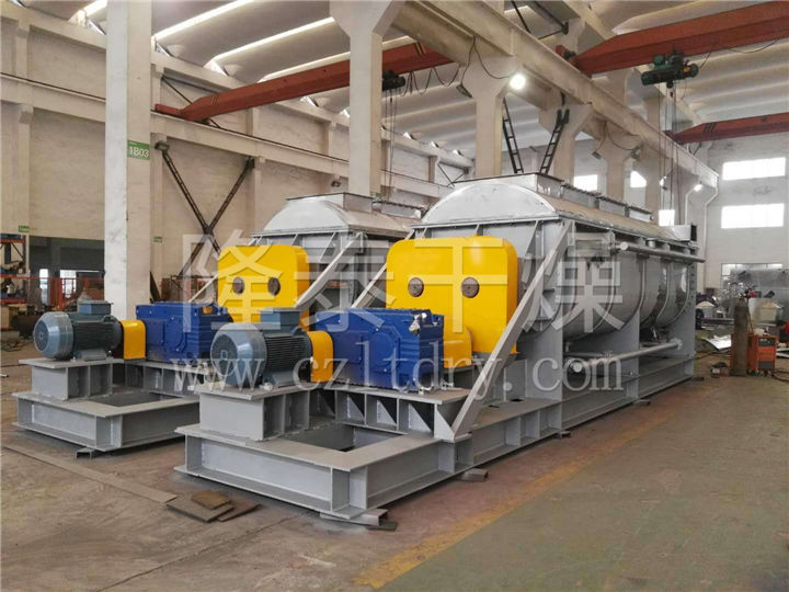 空心轴上密集排列着楔型中空浆叶,热介质经空心轴流经浆叶。单位有效容积内传热面积很大,热介质温度从-40℃到320℃,可以是水蒸汽,也可以是液体型:如热水、导热油等。间接传导加热,没有携带空气带走热量,热量均用来加热物料。热量损失仅为通过器体保温层向环境的散热。楔型浆叶传热面具有自清洁功能。物料颗粒与楔型面的相对运动产生洗刷作用,能够洗刷掉楔型面上附着物料,使运转中一直保持着清洁的传热面。浆叶干燥机的壳体为Ω型,壳体内一般安排二到四根空心搅拌轴。壳体有密封端盖与上盖,防止物料粉尘外泄而充分发挥作用。